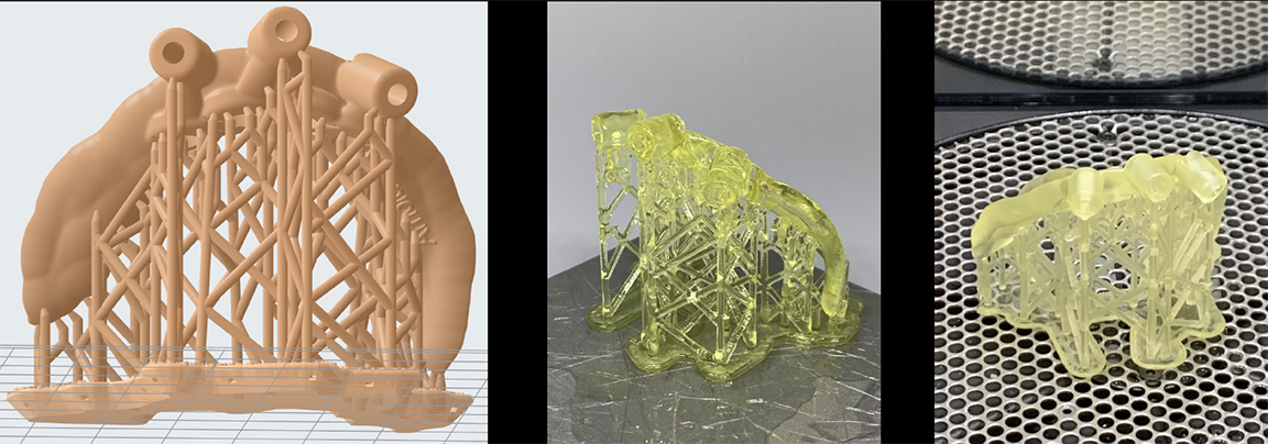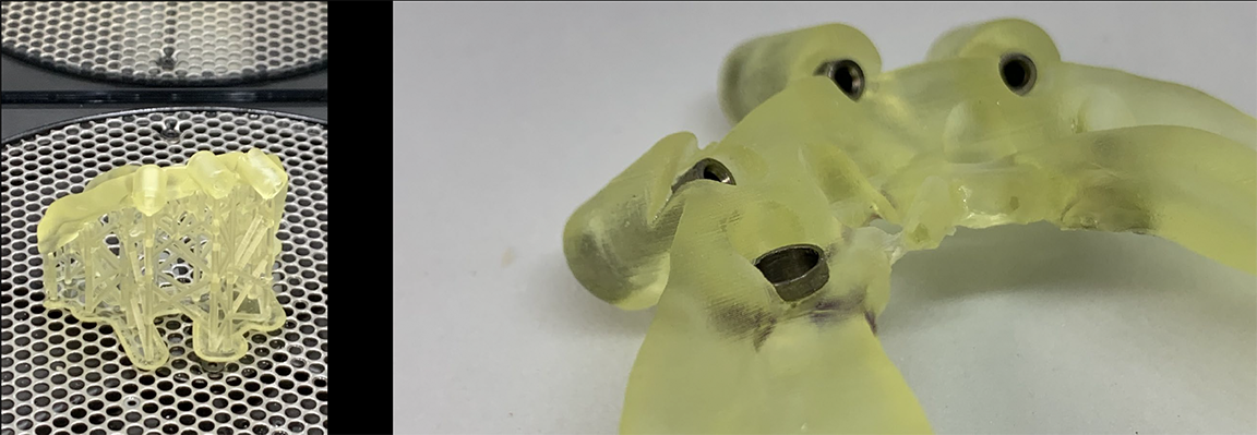 In the case of a two mandibular overdenture surgical plan, a bone fixation pin would be the means of stabilizing the guide throughout the procedure. Much data are required to make sure that every bit of the physical object can be made from the digital file, with many printer supports so the guide can be produced layer by layer through the stereolithographic (STL) process. It comes out of the printer covered in excess resin that must be removed (Figure 3). The resin must be post-cured to achieve final rigidity. After post-curing, print supports must be clipped away, sometimes taking pieces of the guide away with them. Only then are the metal sleeves inserted and bonded into place (Figure 4); sometimes the sleeves protrude through the tissue-contacting surface guides, requiring grinding after the fact to assure a fit into the patient's mouth.10